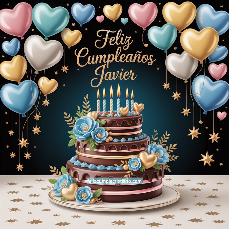 El diseño que acompaña esta serie es verdaderamente encantador: una torta de tres pisos cubierta de chocolate, decorada con flores azules, corazones dorados y detalles elegantes en tonos celestes. Sobre el pastel brillan velas que simbolizan buenos deseos y esperanza. El fondo oscuro resalta los globos en forma de corazón en tonos dorado y celeste creando una atmósfera alegre y sofisticada. En el centro se lee el mensaje “Feliz Cumpleaños Santiago” con una tipografía elegante que puede adaptarse a cualquier nombre masculino.